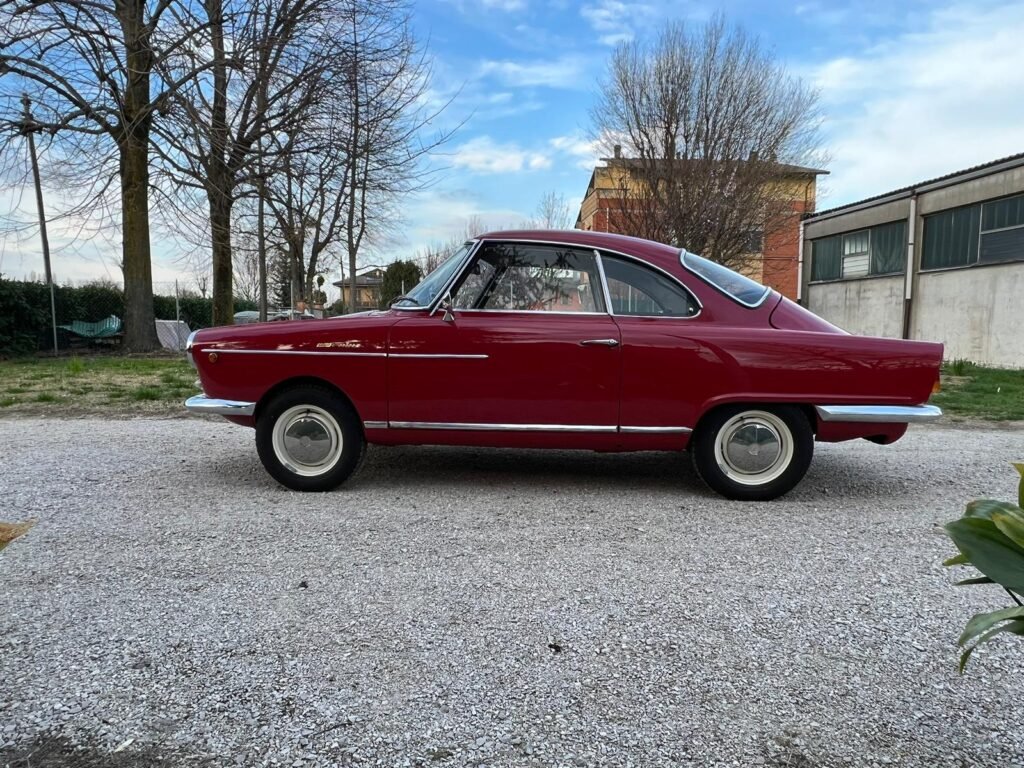 Descrizione: Allo scopo di conferire un’immagine sportiva alle proprie automobili utilitarie, la NSU incaricò la carrozzeria Bertone di studiare una versione sportiva del modello Prinz. Il disegno venne affidato a Franco Scaglione che riuscì a concludere, nonostante le ridotte dimensioni, una equilibrata linea sportiva che suggeriva una vaga somiglianza alla Alfa Romeo Giulietta Sprint, realizzata dallo stesso designer. Il prototipo, corrispondente quasi del tutto alla vettura definitiva, venne ultimato nel luglio del 1958. Dopo alcune modifiche di dettaglio, ecco che nel settembre dello stesso anno avvenne la presentazione alla stampa, mentre il mese successivo la vettura fu svelata in anteprima mondiale al Salone di Parigi. Questo esemplare da noi proposto è stato recentemente totalmente restaurato riproponendo il suo stesso rosso originale.