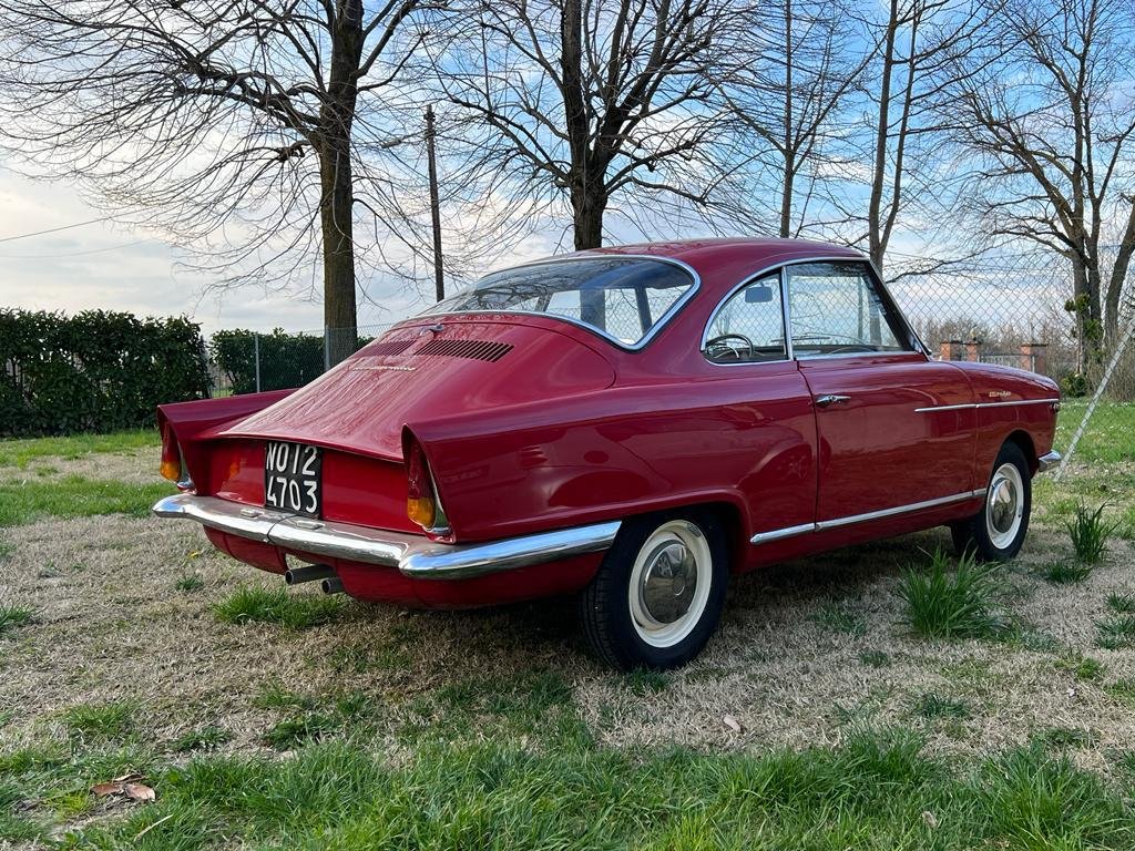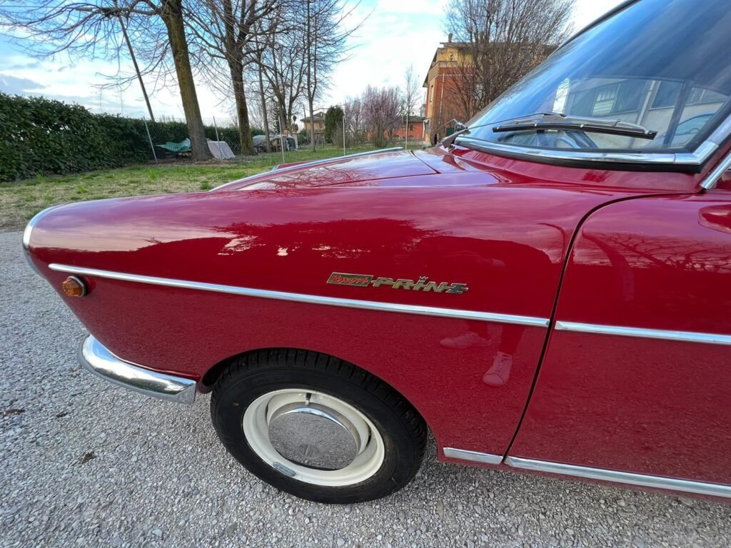 Descrizione: Allo scopo di conferire un’immagine sportiva alle proprie automobili utilitarie, la NSU incaricò la carrozzeria Bertone di studiare una versione sportiva del modello Prinz. Il disegno venne affidato a Franco Scaglione che riuscì a concludere, nonostante le ridotte dimensioni, una equilibrata linea sportiva che suggeriva una vaga somiglianza alla Alfa Romeo Giulietta Sprint, realizzata dallo stesso designer. Il prototipo, corrispondente quasi del tutto alla vettura definitiva, venne ultimato nel luglio del 1958. Dopo alcune modifiche di dettaglio, ecco che nel settembre dello stesso anno avvenne la presentazione alla stampa, mentre il mese successivo la vettura fu svelata in anteprima mondiale al Salone di Parigi. Questo esemplare da noi proposto è stato recentemente totalmente restaurato riproponendo il suo stesso rosso originale.